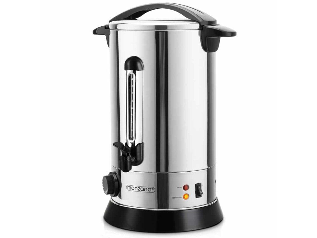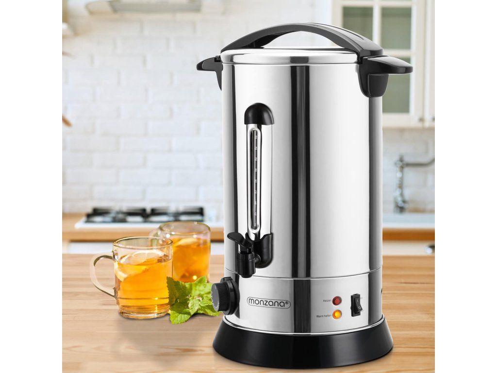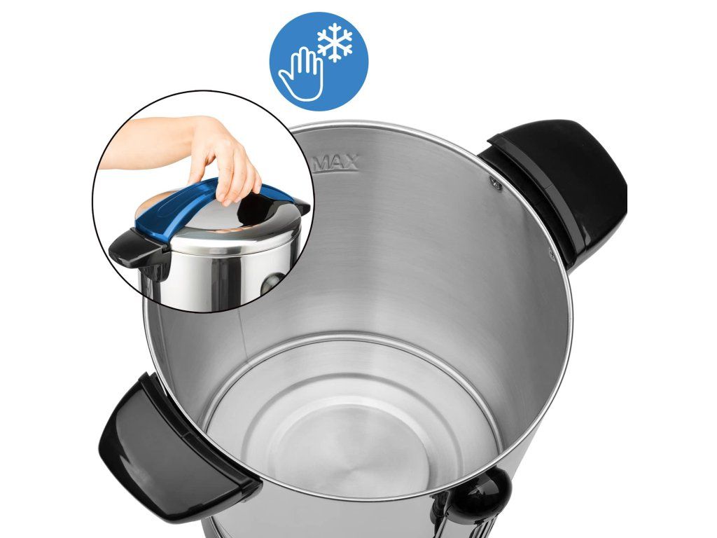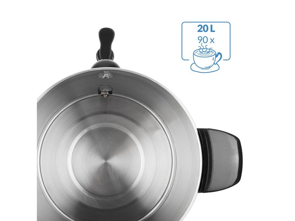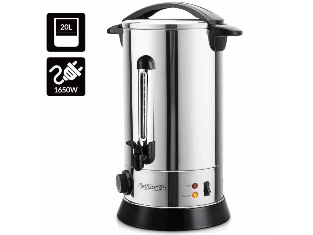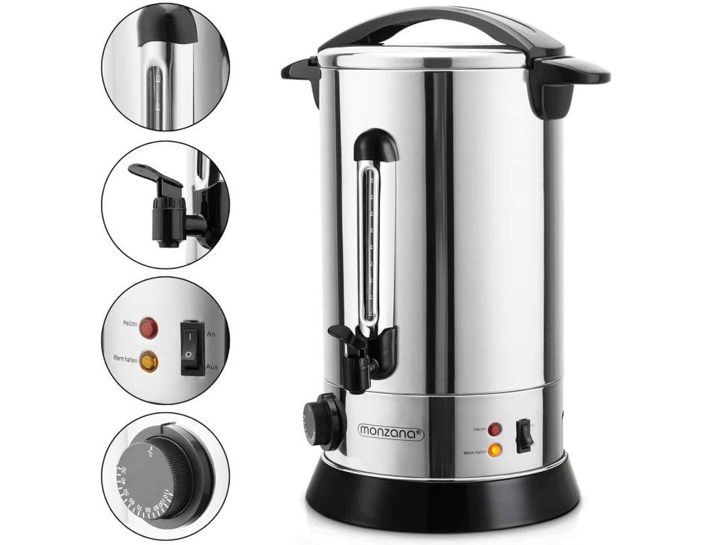 Aragaz de înaltă calitate de 20 de litri pentru vin fiert, cu lăţişor de celonă de calitate gastronomică, termostat şi o sticlă de unică folosinţă, fără umiditate. Scara nivelului de umplere vă arată câte cupe sunt întotdeauna disponibile. Folosind un termostat, puteți determina cât de caldă/fierbinte ar trebui să fie băutura (30-110 grade). Aragazul de vin fiert este unul nou și protejat datorită unui strat de oțel inoxidabil cu dispozitive de fixare. Datorită bazei foarte largi, aragazul are un nivel ridicat de stabilitate.