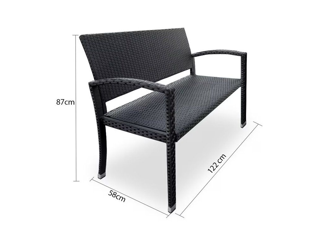 Această bancă din poliratan este proiectată pentru șezut confortabil pentru două persoane, ideală pentru balconul sau terasa dumneavoastră. Cu spătar și cotiere, oferă confort maxim pentru relaxare. Poliratanul este o fibră plastică rezistentă și uniform împletită, special creată pentru mobilierul de exterior. Se remarcă prin rezistență la intemperii, radiații UV, murdărie și este foarte ușor de întreținut.