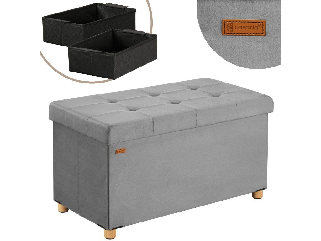 Banca de depozitare din catifea moale impresionează prin stil, confort și funcționalitate. Banca cu un volum de 100 L poate stoca cu ușurință pături, perne și alte obiecte. Capacul extra gros, căptușit, vă invită să vă așezați confortabil. Designul elegant cu picioare de lemn solide aduce un farmec în orice spațiu, fie că este vorba de un living, dormitor sau hol. Cu o capacitate de până la 300 kg, banca este extrem de robustă, asigurând în același timp o siguranță suficientă. Designul inovator asigură protecția podelei. Când banca nu este utilizată, poate fi ușor de pliat și depozitat, economisind astfel spațiu. Un adevărat ajutor versatil care atrage atenția în orice gospodărie.Avantajele produsului: