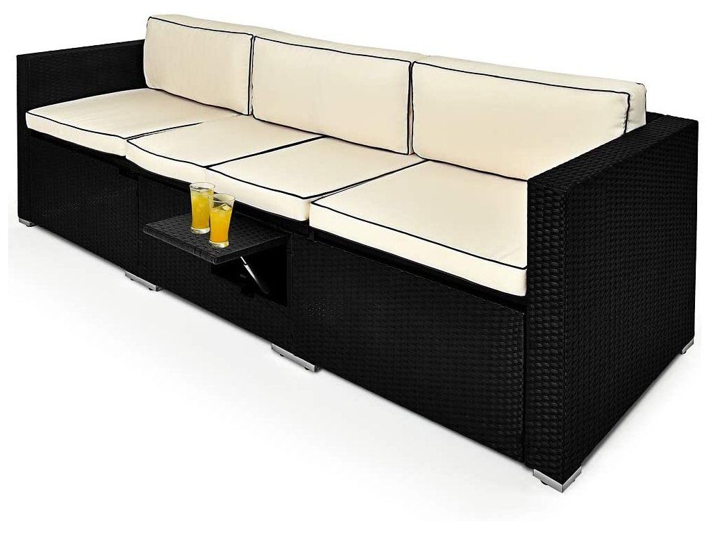 Mobilierul din poliratan este robust, durabil și optim potrivit pentru utilizare zilnică. Poliratanul a fost dezvoltat special pentru fabricarea mobilierului de grădină, este rezistent la condițiile meteorologice, la radiațiile UV și se curăță ușor. Canapeaua din ratan cu cadru din oțel cu acoperire cu pulbere are opțiuni flexibile de reglare a poziției. Datorită suporturilor duble robuste, poate fi reglată pe înălțime de până la 5 ori. Este echipată cu o măsuță, care poate fi rabatată cu ajutorul unui piston cu gaz. Pernele cu grosimea de 7 cm și spătarele cu grosimea de 20 cm asigură un confort ridicat la ședere. Husele detașabile cu fermoar pot fi fixate pe pat. Sunt hidrofobe. Lichidele și fluidele nu sunt absorbite imediat și pot fi șterse cu ușurință.