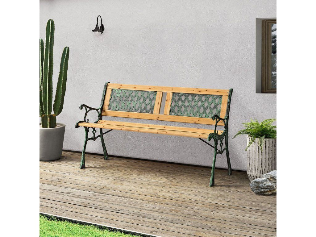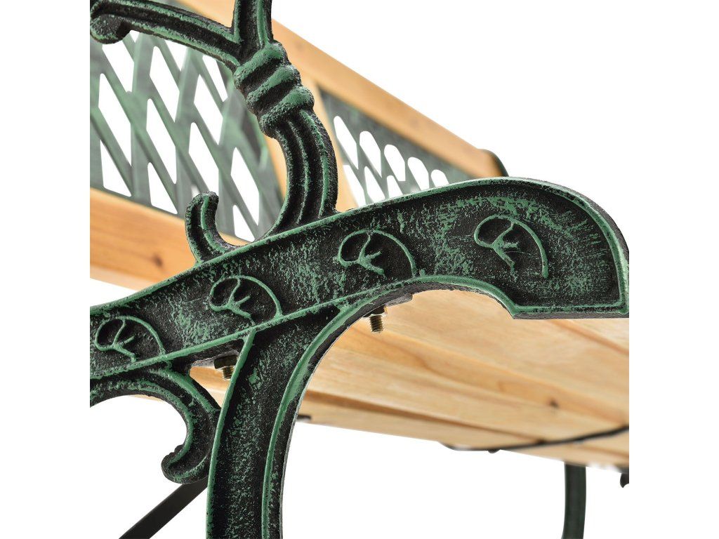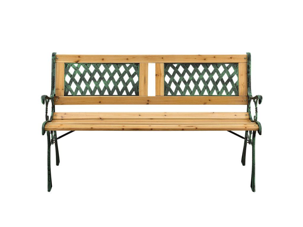 Banca de grădină Sanremo este realizată din lemn de brad lăcuit și laturi din fontă cu efect de patină. Pe banca de 122 cm lungime și 54 cm adâncime se pot așeza confortabil 2 persoane. Cotierele practice vă oferă un plus de confort. Picioarele sunt conectate la tijele de legătură ale scaunului, ceea ce asigură stabilitate și durabilitate suplimentare. Elementele decorative frumoase de pe cotieră conferă băncii cu 2 locuri un farmec atmosferic. Elementele din plastic sunt în mijloc separate de două grinzi verticale din lemn.