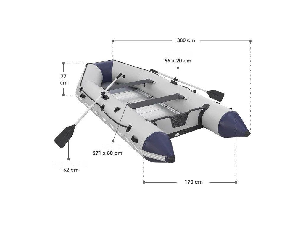 Bărcile gonflabile pot fi depozitate și reparate. Cu modelul nostru lung de 380 cm cu 2 bănci vă puteți bucura de călătoria dvs. pe lac. Setul complet include palete, pompă de aer, sac pentru transport și multe alte gadgeturi. Barca gonflabilă mare de 380 cm lungime și 170 cm lățime oferă spațiu pentru 6 adulți. Două bănci practice oferă un confort suplimentar. Barca stabilă generală transportă o sarcină de până la 727 kg. Materialul PVC extrem de durabil este pliat în 3 straturi. Podea din patru scânduri din aluminiu oferă o stabilitate suplimentară. Partea principală a pachetului este o pompă de aer de picior, care vă va ajuta să umflați rapid barca cu o presiune de 0,25 până la 0,35 bari. Cu un total de 3 camere de aer, veți găsi bărci gonflabile cu siguranță sporită pe apă. Setul include două palete lungi de 162 cm. Există 4 mânere pe lateral pentru a scoate barca din apă. Un sortiment extins de accesorii include un set de reparații. Se compune din lipici și plasturi pentru repararea imediată a daunelor minore, precum și zgârieturi și scurgeri pe arcul gonflabil.