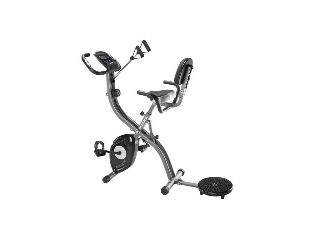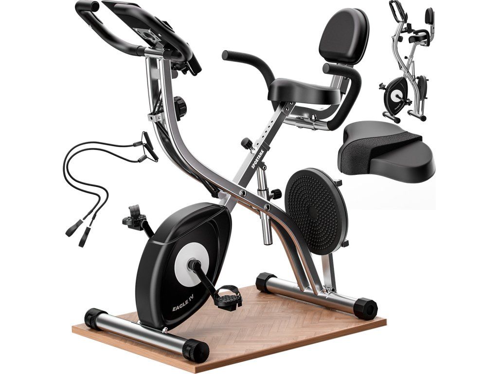Această bicicletă de exerciții poate fi transformată rapid și ușor și intr-un șezlong. Înălțimea scaunului ergonomic căptușit cu cotieră poate fi reglată în funcție de înălțimea proprie în șapte poziții cu ajutorul unui buton de tensionare. Pedalele de cauciuc și canelură pot fi ajustate la dimensiunea piciorului, ceea ce previne alunecarea. Mânerele au o formă ergonomică.
