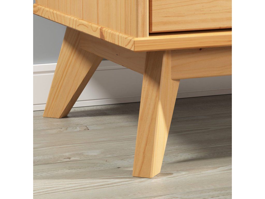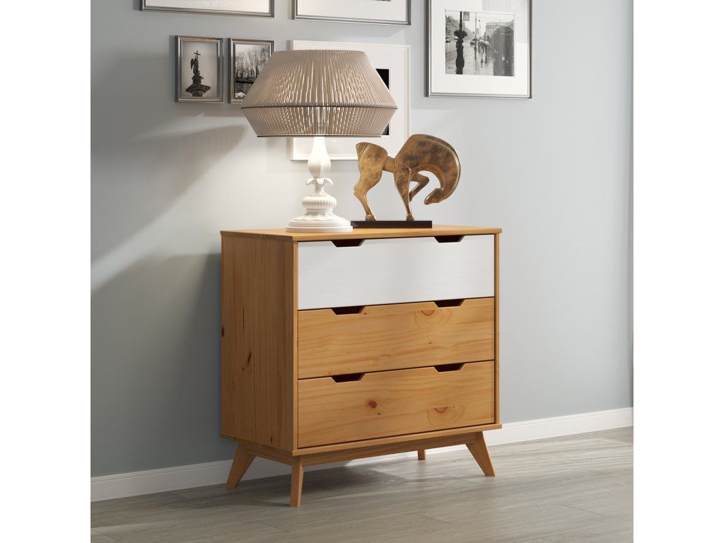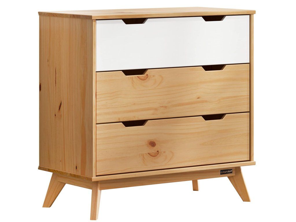 Comoda elegantă în stil scandinav este realizată din lemn de pin de înaltă calitate provenit din silvicultură sustenabilă, certificat FSC®, recunoscut pentru durabilitatea și sustenabilitatea sa. Datorită suprafeței finisate natural și desenului unic al lemnului, fiecare comodă este unică. Mânerele frezate, încastrate, subliniază caracterul modern al mobilierului. Trei sertare mari și spațioase oferă o soluție excelentă de depozitare. Comoda poate suporta o greutate totală de 45 kg. Șinele din oțel inoxidabil cu glisare lină asigură deschiderea și închiderea foarte ușoară a sertarelor. Picioarele conice din lemn masiv asigură stabilitate și suport sigur. Pentru o siguranță sporită, comoda are opțiunea de fixare în partea din spate, pentru a putea fi prinsă de perete. Datorită lemnului de înaltă calitate, comoda este deosebit de rezistentă și ușor de întreținut.