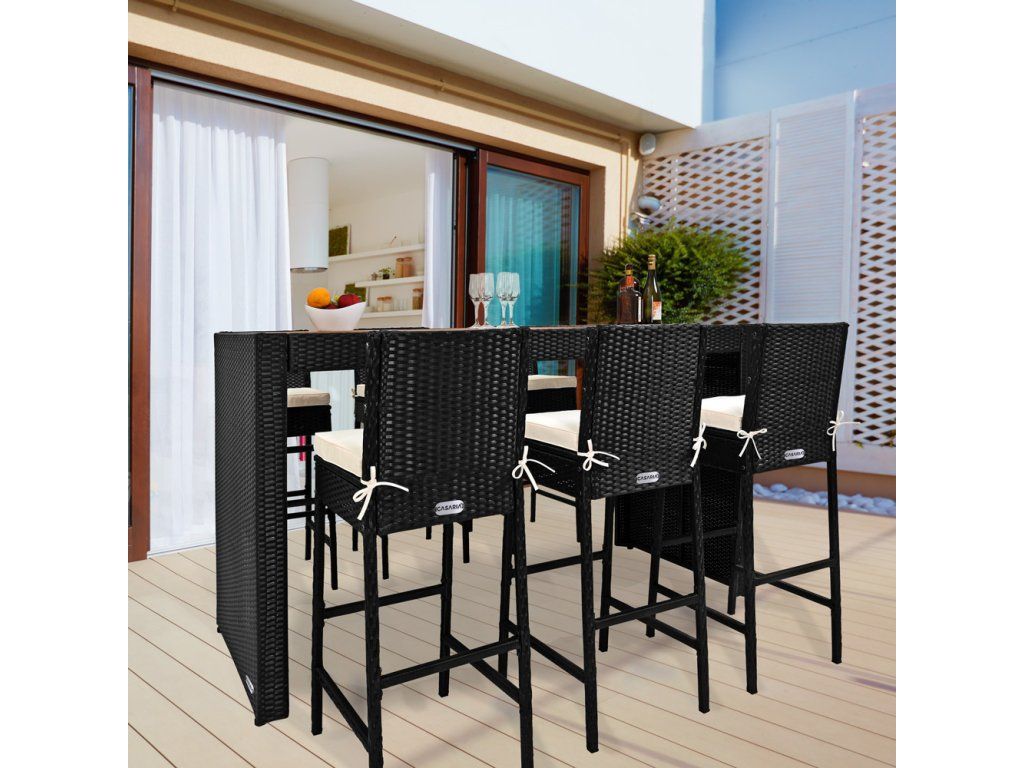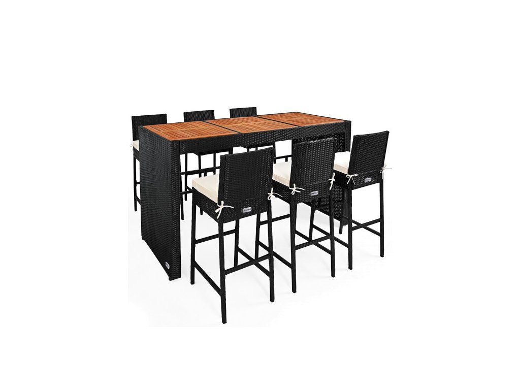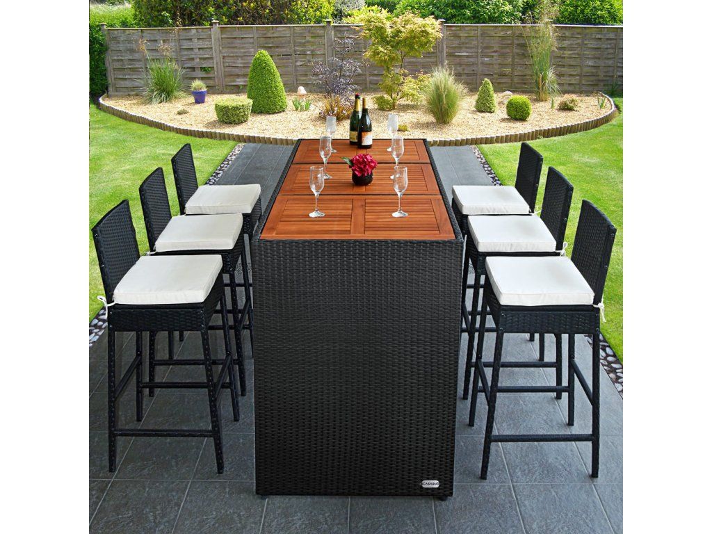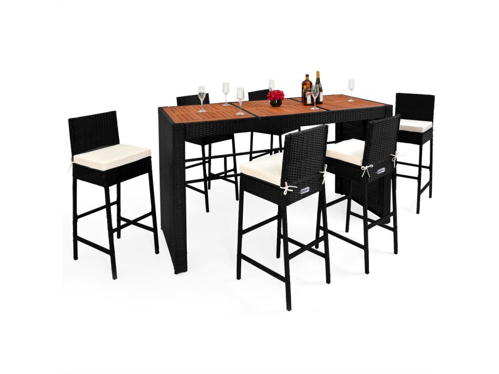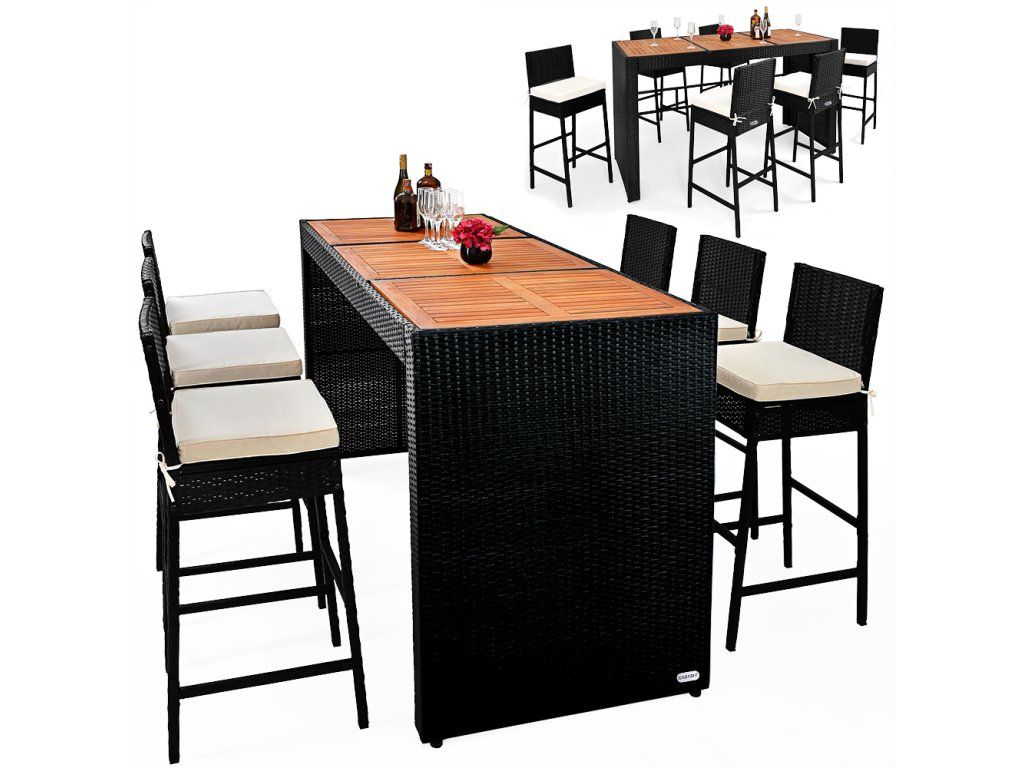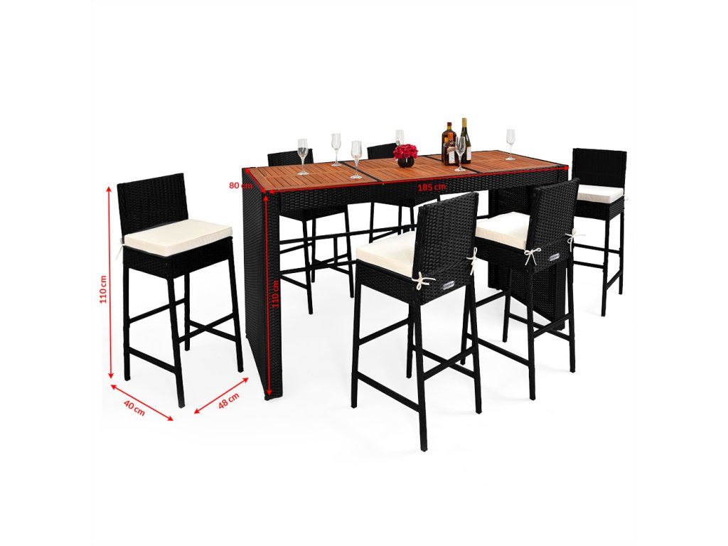 Setul bar este compus dintr-o masă lungă cu blat din lemn de acacia, care este optic separată în mijloc de ratan, și 6 scaune de bar cu perne de șezut. Datorită construcției ușoare, setul de mobilier de grădină este multifuncțional. Fibra de ratan este foarte stabilă, fiind un fir de plastic uniform răsucit, special dezvoltat pentru mobilierul de grădină, de aceea este rezistent la intemperii, la radiații UV, se curăță ușor și respinge murdăria. Pernele de șezut sunt incluse, au o grosime de 7 cm și oferă un confort plăcut la ședere. Husele pernelor sunt hidrofobe. Astfel, lichidele nu sunt absorbite imediat și pot fi șterse ușor fără a lăsa urme. Setul bar este ușor, ceea ce îl face ușor de manevrat.