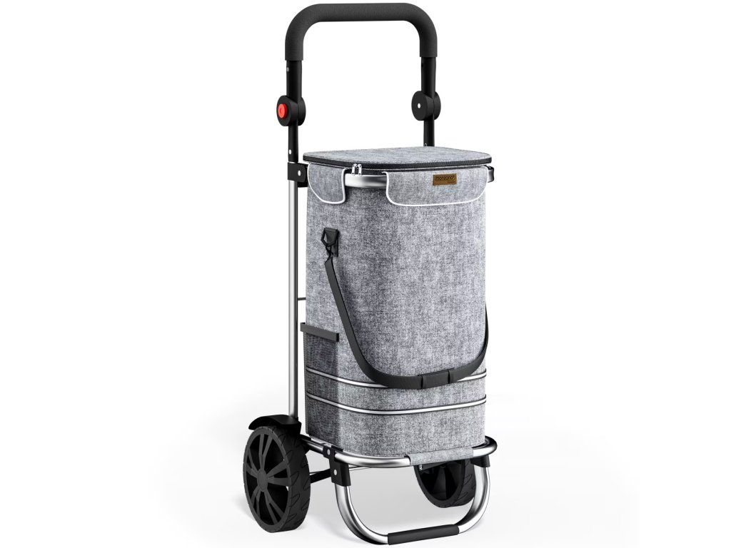 Căruciorul de cumpărături are un volum de 56 l și poate fi încărcat până la 50 kg. Datorită cadrului ușor de aluminiu și roților cauciucate cu rulmenți cu bile, căruciorul de cumpărături este ușor de manevrat. Utilizați căruciorul de cumpărături ca o geantă practică de umăr sau folosiți cadru ca un cărucior de mână mic. Puteți agăța și geanta pe coșul de cumpărături cu ajutorul cârligelor. Datorită sistemului simplu de închidere cu fermoar, puteți atașa geanta la cadru într-o clipă. Compartimentul integrat de răcire este ideal pentru transportul alimentelor congelate. Puteți stoca umbrela în compartimentul practic exterior și un mic compartiment cu fermoar este ideal pentru stocarea portofelului, cheilor sau telefonului mobil.Beneficiile produsului:
