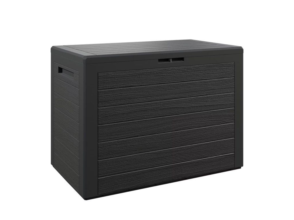 Cutie extensibilă din plastic, în formă de lemn, oferă spațiu pentru grătare, grătare și alte accesorii de grădină. Capacul articulat cu mecanism de blocare poate fi blocat cu o blocare rapidă. Cutia este echipată cu suporturi pentru sticle pentru o mai bună manipulare.