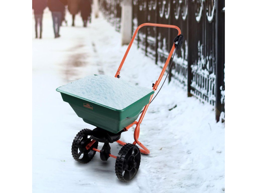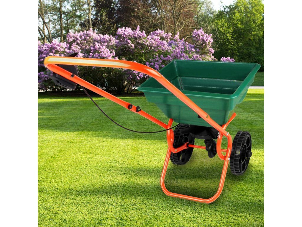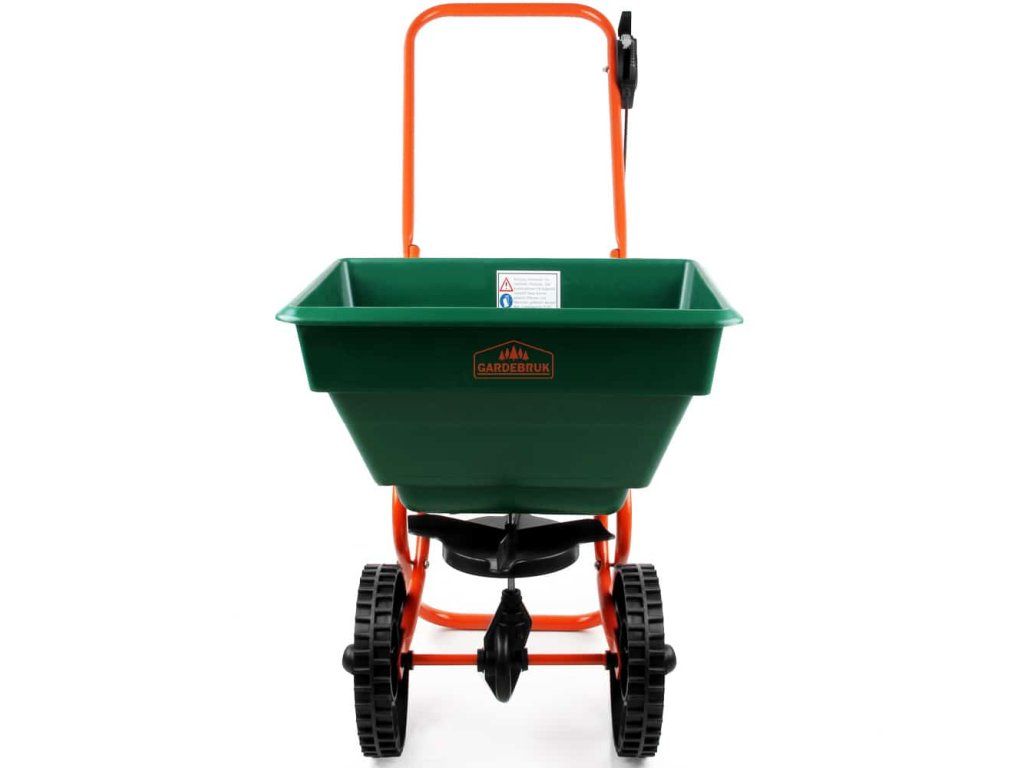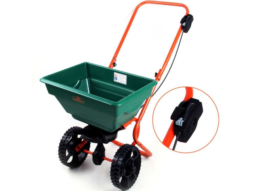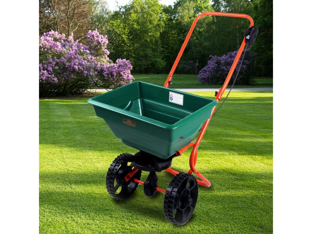 Dispozitivul de împrăștiere poate fi utilizat pentru uz privat în grădină sau pe drum. Cu recipientul de 25 de litri puteți împrăștiarapid și eficient îngrășământ, semințe, sare, nisip și multe altele. Roțile mari îl fac ușor de transportat oriunde. Versatil cu o construcție robustă și durabilitate. Cantitatea poate fi controlată cu 10 niveluri de reglare. Utilizați erbicide, pesticide sau combinații cu precauție extremă. Acestea pot fi periculoase pentru alte plante și oameni. Capacitate maximă de încărcare 25 kg.