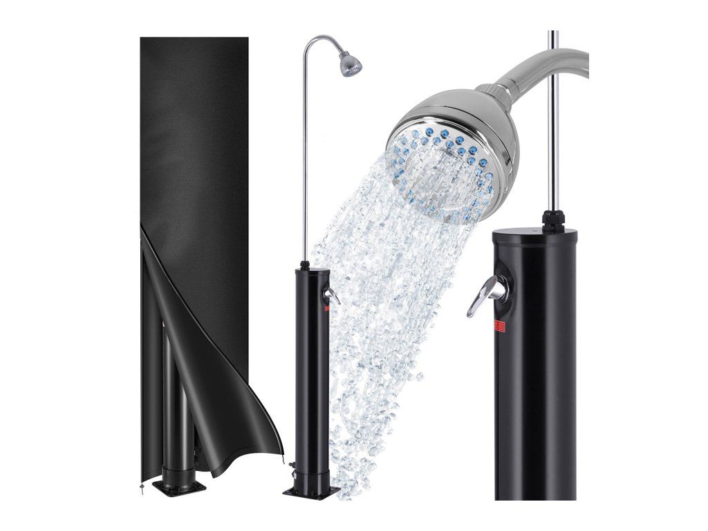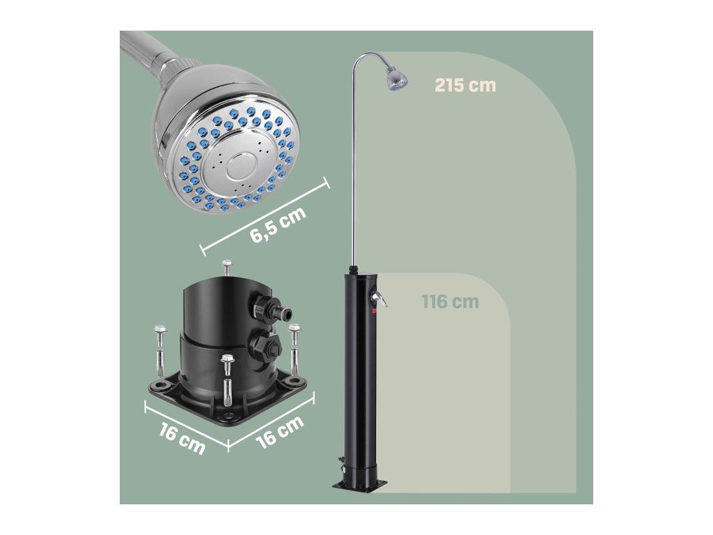 Apă caldă cu puterea naturală a energiei solare! Cu o înălțime totală de 215 cm, chiar și persoanele foarte înalte pot utiliza dușul. Capul de duș pivotant poate fi ușor reglat în poziția dorită. Rezervorul spațios din plastic poate conține 18 litri de apă, care este încălzită de soare până la 60°. Acest lucru economisește energie electrică și utilizează puterea naturală a soarelui. Temperatura dorită a apei este setată în mod optim cu ajutorul robinetului cu un singur levier. Datorită conexiunii rapide la rezervor, orice furtun de grădină standard poate fi conectat direct. Conducta de duș este pur și simplu detașată de rezervor pentru a economisi spațiu; șurubul de scurgere a apei permite golirea rapidă a rezervorului.
