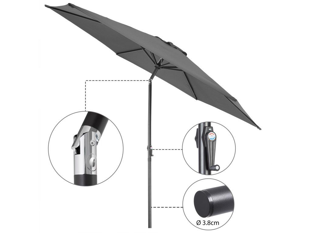 Umbrela vă protejează în mod fiabil de soare datorită protecției UV 80+. Este ideală pentru balcon, grădină sau terasă. Partea superioară a umbrelei poate fi înclinată la 45 de grade în lateral, după cum este necesar. Husa este fabricată din material hidrofug. Parasolarul este fabricat din aluminiu, este rezistent la UV și ușor de deschis și închis cu ajutorul sistemului integrat de manivelă. De asemenea, poate fi desfăcut în 2 părți, ideal pentru depozitare iarna sau pentru transport. Deschiderea de sus asigură o ventilație suficientă, deoarece aerul care vine de dedesubt poate ieși în sus, împiedicând acumularea de căldură sub umbrelă.