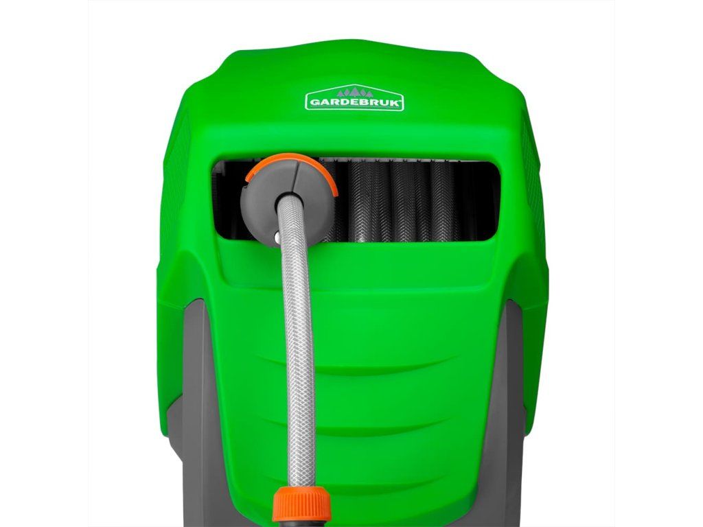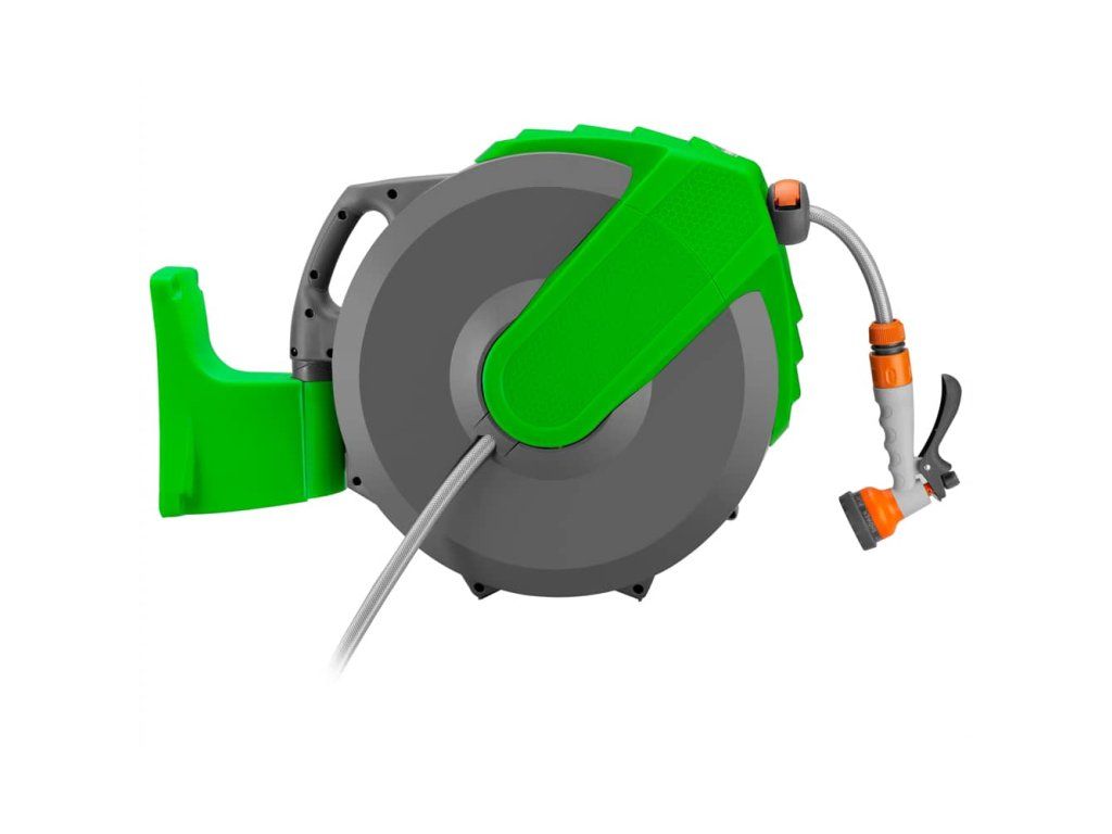 Mecanismul automat de înfășurare cu ghidaj integrat pentru furtun previne încâlcirea în timpul rulării. Furtunul nu se îndoaie în timpul udării datorită tamburului rotativ la 180°. Dușul manual cu cuplaj rapid are opțiuni de reglare pentru orice scop. Suportul se montează ușor pe perete cu materialul de montaj inclus. Iarna, tamburul pentru furtun poate fi depozitat în interior, într-un loc ferit de îngheț.