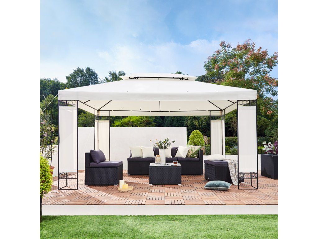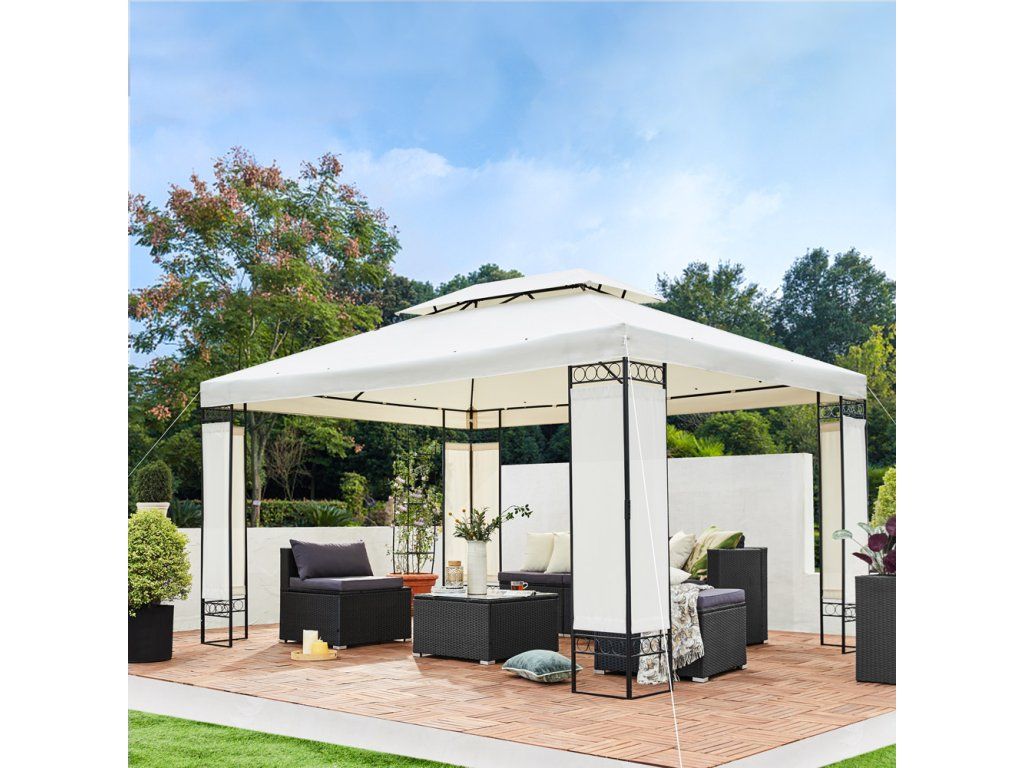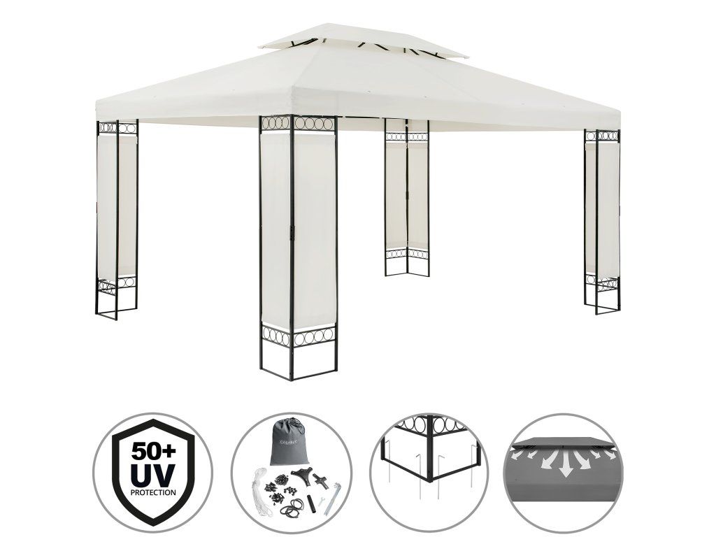 Foișorul de grădină este echipat cu stâlpi de acoperiș rezistenți și picioare panelate. Acoperirea cu pulbere a construcției metalice oferă protecție împotriva coroziunii, astfel încât să vă puteți bucura de cortul dvs. de grădină pentru o lungă perioadă de timp.