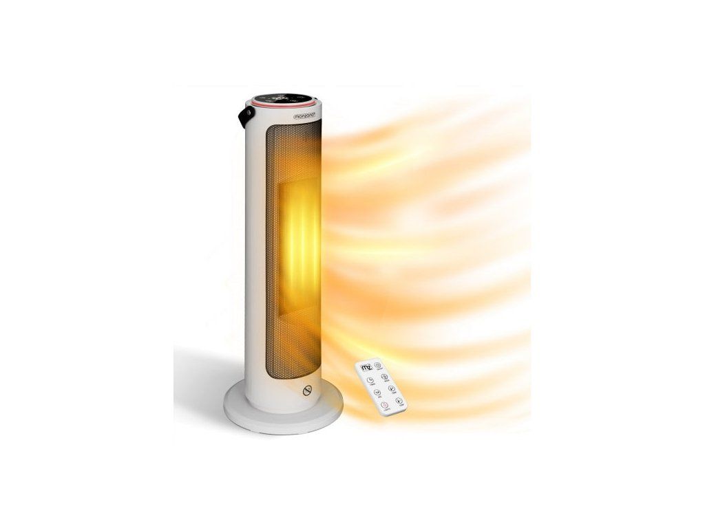 Încălzitorul 2 în 1 de înaltă calitate are o putere puternică de 2000 wați. Temperatura poate fi reglată între 15 și 35°C și poate fi folosit și ca ventilator. 2 ventilatoare axiale puternice și silențioase asigură o distribuție eficientă a aerului. Încălzitorul oferă 4 moduri diferite. În funcție de temperatură, LED-urile se aprind în culori diferite: ventilator: albastru, temperatură medie: roșu deschis, temperatură ridicată: roșu, mod ECO economic: schimbare de culoare roșie. Cronometrul poate fi setat între 1 și 9 ore. În modul de noapte, afișajul este oprit pentru a nu deranja cu lumină. Căldura este distribuită optim prin oscilație de 70°. Toate funcțiile pot fi utilizate confortabil de pe canapea datorită telecomenzii sau direct pe dispozitiv prin intermediul unui ecran tactil elegant. Pentru siguranță, există o grilă metalică robustă în fața elementului de încălzire, precum și protecție împotriva răsturnării și supraîncălzirii. Datorită mânerului cu aspect de piele, încălzitorul electric poate fi mutat rapid în locul dorit.