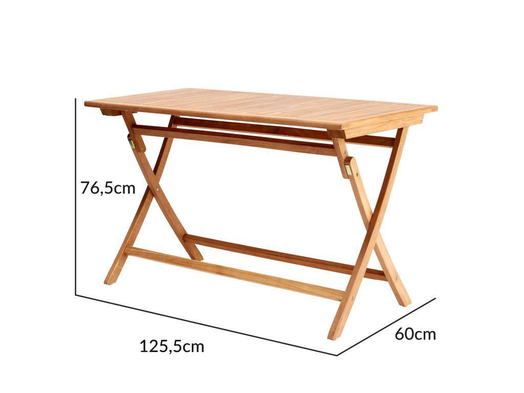 Datorită plăcii mari de masă, masa poate găzdui până la 6 persoane.Lemnul de tec se caracterizează prin conținut ridicat de ulei. Acest ulei servește ca un protector împotriva infestării cu ciuperci și insecte, precum și a schimbărilor de vreme și temperatură. Datorită acestui fapt, scaunul din lemn nu necesită întreținere și rezistență durabilă la apă.