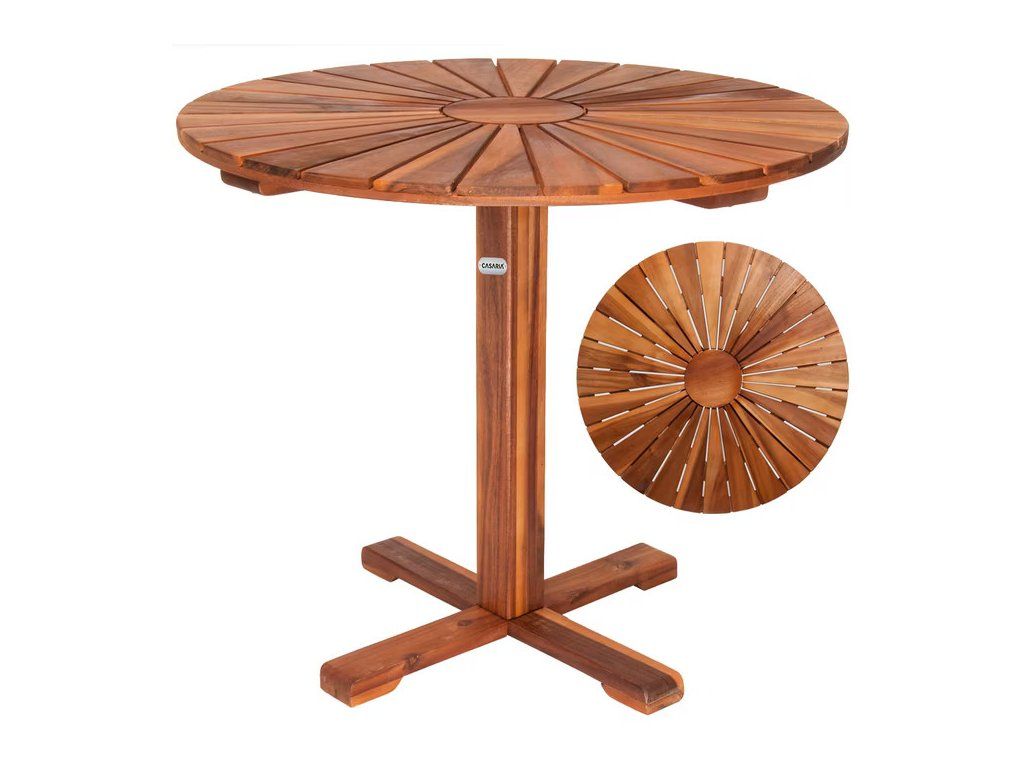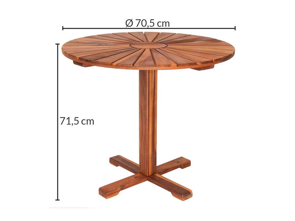 Masă decorativă de grădină pentru balcon, terasă sau grădină. Acest tabel de grădină rezistent la influențele poluante a fost fabricat din lemn acat masiv și a fost naoleat în prealabil. Masa are 4 picioare și o masă rotundă cu un model însorit.