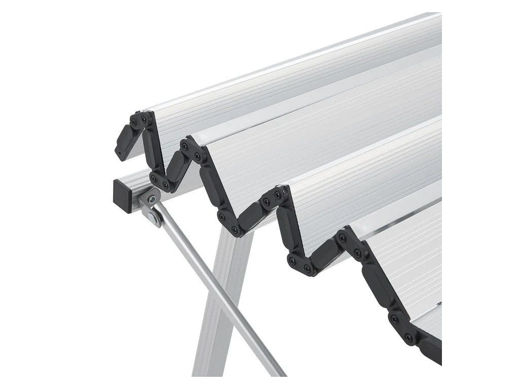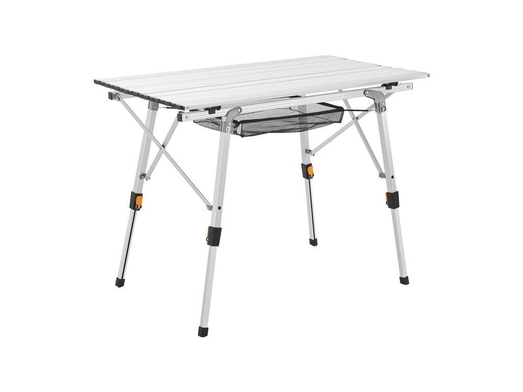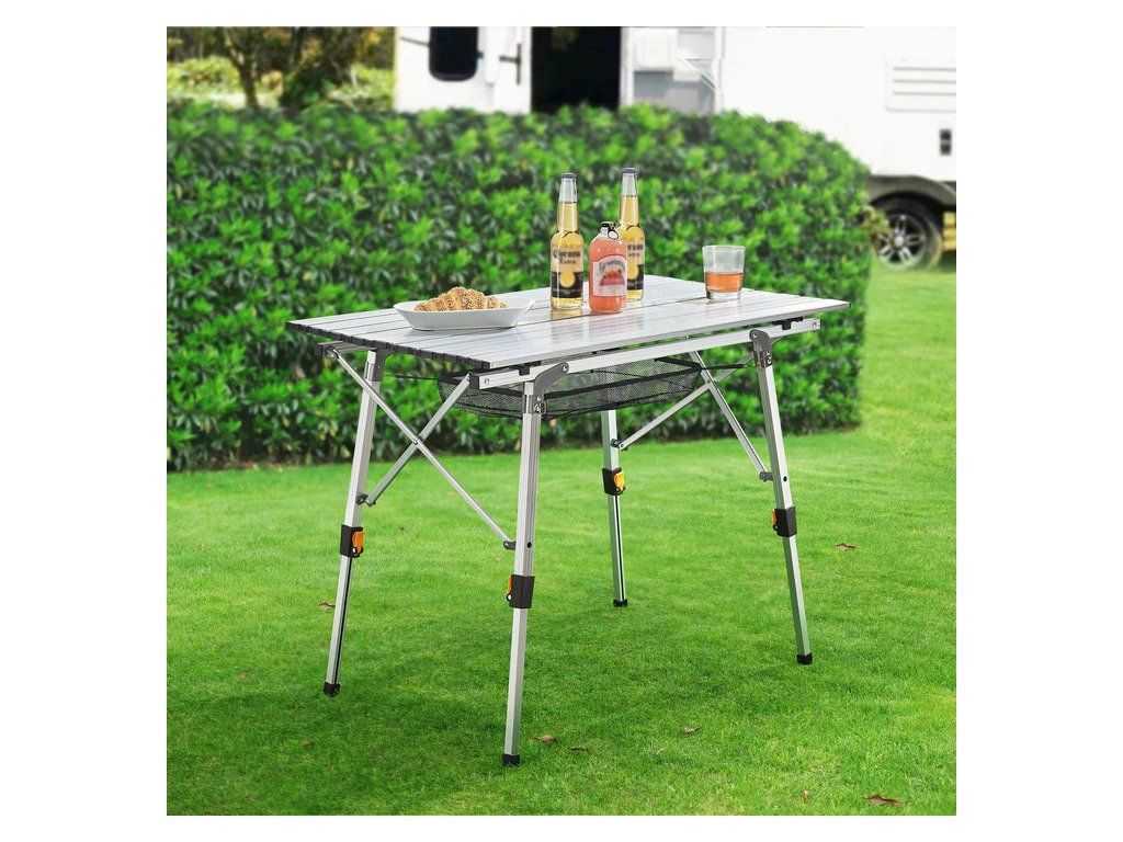 Tabelul de amenajare a campingului este un șezut integrator sub masa de masă, care servește ca un alt spațiu de relaxare. Este reglabil pe înălțime de la 45 la 68 cm și poate transporta până la 30 kg. Când vine vorba de afaceri, alegeți întotdeauna înălțimea mesei care vi se potrivește. Masa poate fi îndepărtată și depozitată într-o pungă pentru a economisi spațiu. Masa de camping din aluminiu este stabilă și ușoară în același timp, dar are și picioare din plastic anti-alunecare