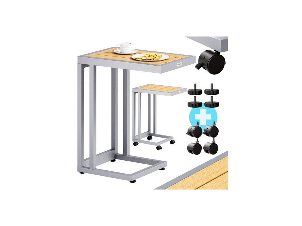 Această masă elegantă are o formă simplă, care se adaptează oricărui stil de locuit. Scaunul de prindere este datorită materialelor rezistente la influențele de mediu ale partenerilor ideali în grădini, dar și la căsuțele laterale în camera de odihnă. Masa mobilă și economisitoare de spațiu cu cadru din oțel în formă de C poate fi alunecată sub canapea sau pat. Are 4 roți, dintre care două pot fi blocate de frână și astfel dorm atunci când sunt împinse. În cazul nevoilor, bicicleta poate înlocui 4 picioare reglabile pe înălțime. Datorită desenului de masă din WPC - amestecul de lemn rezistent la influențe de mediu este scaun și pentru exterior. Este ușor de întreținut, este ușor de curățat cu o cârpă umedă și se instalează rapid și rapid.