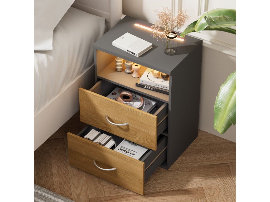 Noptiera cu un aspect atemporal și elegant are iluminare LED integrată. Se potrivește cu ușurință în orice dormitor. Datorită tehnologiei tactile, masa va porni atingerea și casa dvs. va crește. Rafturile spațioase și 2 sertare cu mânere în aspect cromat vor umple suficient spațiu pentru spațiul personal.