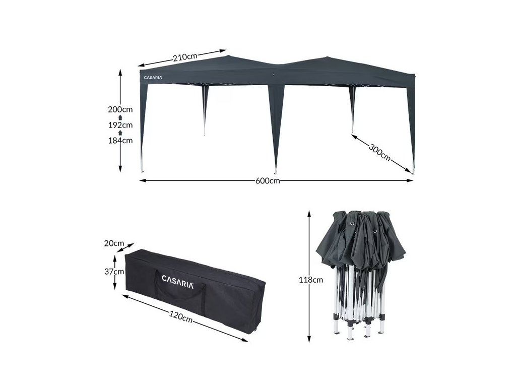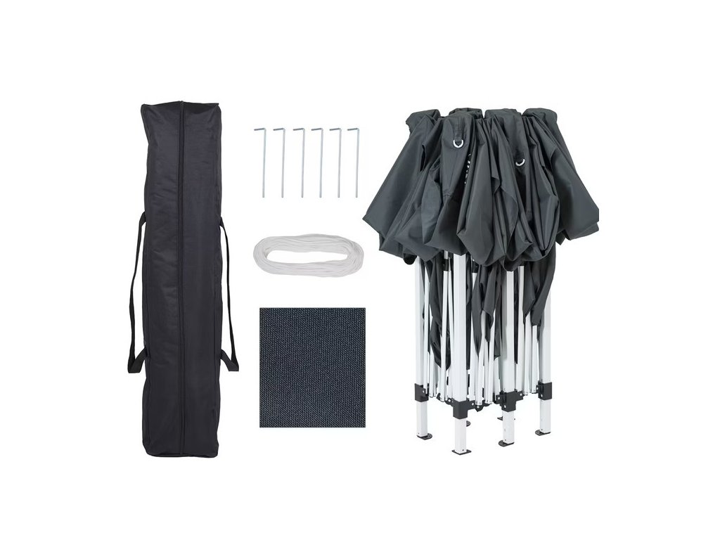 Datorită sistemului practic de pliere, pavilionul poate fi complet pliat în câțiva pași. Barele de metal și picioarele de ancorare oferă pavilionului o construcție stabilă. Țevile de oțel au o grosime de 0,7 mm. Acoperișul este fabricat din poliester rezistent la apă cu un strat de PA. Husa are protecție UV împotriva soarelui 50+. Înălțimea pavilionului poate fi ajustată de 3 ori cu ajutorul picioarelor de susținere: 184 - 192 - 200 cm. Îl puteți plia și depozita rapid în sacul portabil Oxford 600 D, pentru a economisi spațiu.Beneficiile produsului:- Pop-up - montaj rapid