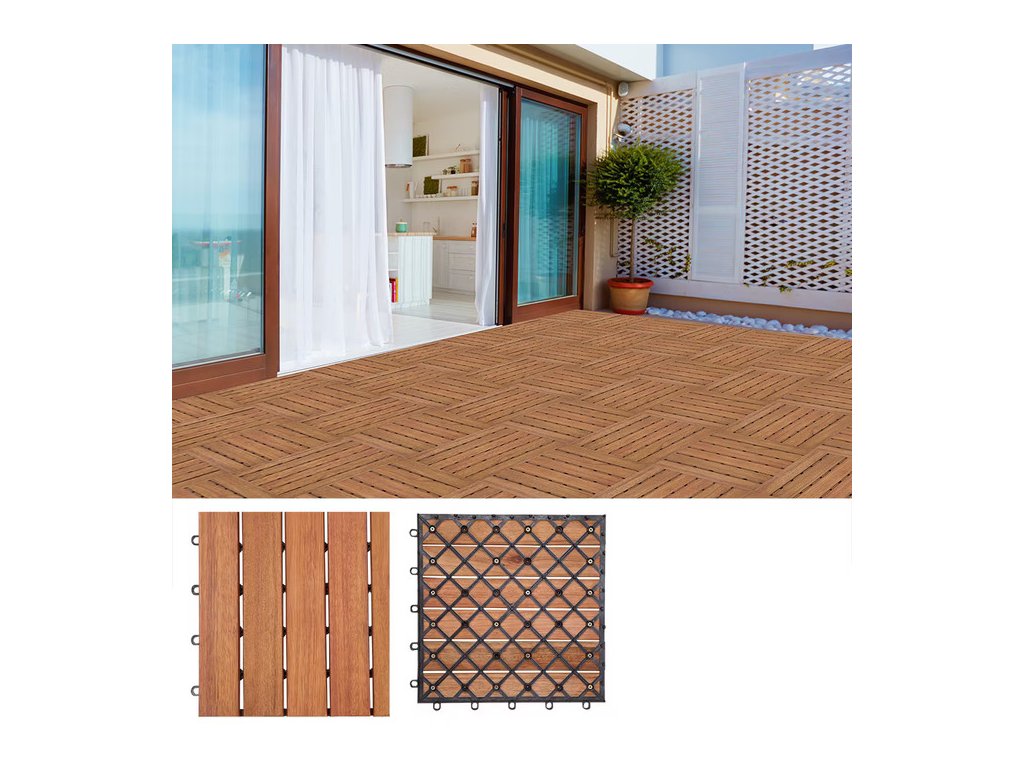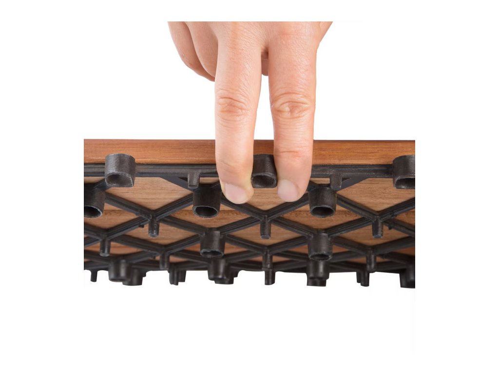 Pardoseala din dale este tratată cu ulei din lemn masiv de eucalipt și poate fi utilizată atât în interior cât și în exterior. Nu este necesar niciun instrument, găurire sau lipire. Trebuie doar să le fixați și să vă bucurați de noua pardoseală, de exemplu pe terasă, în duș, baie, piscină. Dalele pot fi oricând îndepărtate și relocate. Aceste dale rezistă foarte mult timp cu întreținere minimă. Dalele pot fi utilizate pe gazon, beton, sol sau chiar pe covor. Sistemul de plastic asigură un flux de apă fiabil sub dale și sistemul este rezistent la condițiile meteorologice. Structura de bază este fabricată din plastic incasabil. Pentru a menține culoarea intensă și durabilitatea pe termen lung, recomandăm tratarea regulată a lemnului cu un ulei special pentru mobilier de grădină.Beneficiile produsului: