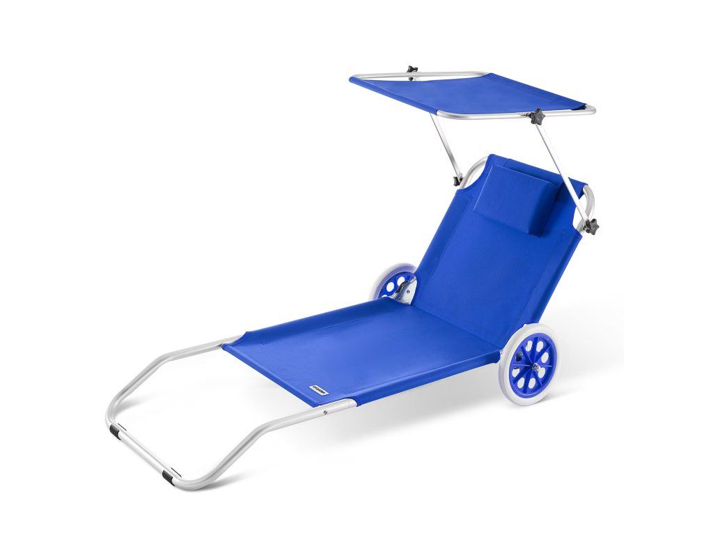 Șezlongul pliabil poate fi mutat cu ușurință datorită celor 2 roți robuste și poate fi pliat pentru a economisi spațiu. Șezlongul dispune și de o copertină solară reglabilă și de o pernă pentru cap. Husa suprafeței de întins este rezistentă la rupere, lavabilă și se usucă rapid. Buzunarul suplimentar din spătar este ideal pentru depozitarea obiectelor mici și pentru protejarea acestora de nisip.