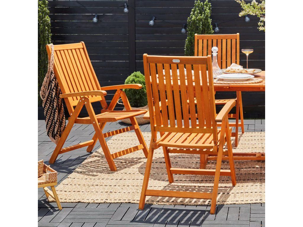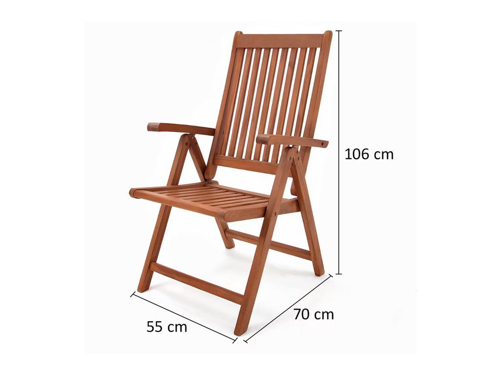 Spătarele ergonomic formate ale scaunelor pliabile vă garantează o ședere confortabilă și relaxată. Scaunele echipate cu 9 bare și spătarul cu 8 bare oferă stabilitatea și rezistența necesară. În plus, spătarul reglabil în 5 poziții diferite vă permite să găsiți poziția ideală pentru serile de relaxare cu familia sau prietenii. Designul atemporal al scaunelor se potrivește perfect cu mesele de grădină. Datorită lemnului de eucalipt rezistent, care rezistă chiar și la condiții meteorologice nefavorabile, veți beneficia de calitatea lor pentru mulți ani. Întreținerea este simplă - este suficient să le ștergeți cu o cârpă umedă. Pentru a menține culoarea intensă și o durată de viață lungă, recomandăm tratarea regulată a lemnului cu un ulei special pentru mobilier de grădină.Beneficiile produsului: