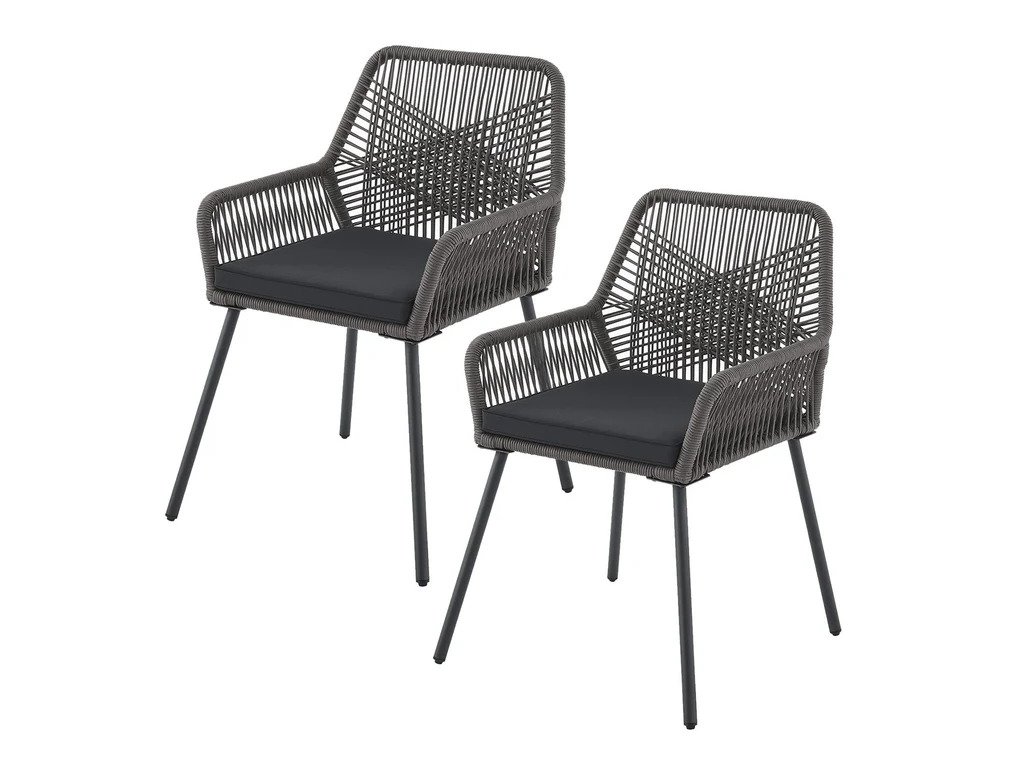 Rețeaua de cabluri și tapițeria groasă nu numai că arată bine, dar asigură și un confort ridicat al șederii. Construcția este extrem de robustă și datorită vopsirii în pulbere este rezistentă la coroziune și zgârieturi. Fiecare scaun are o capacitate de până la 150 kg. Scaunele includ perne confortabile. Scaunele cu design modern se potrivesc ideal în grădină, pe terasă, balcon sau în grădina de iarnă.Specificații tehnice: