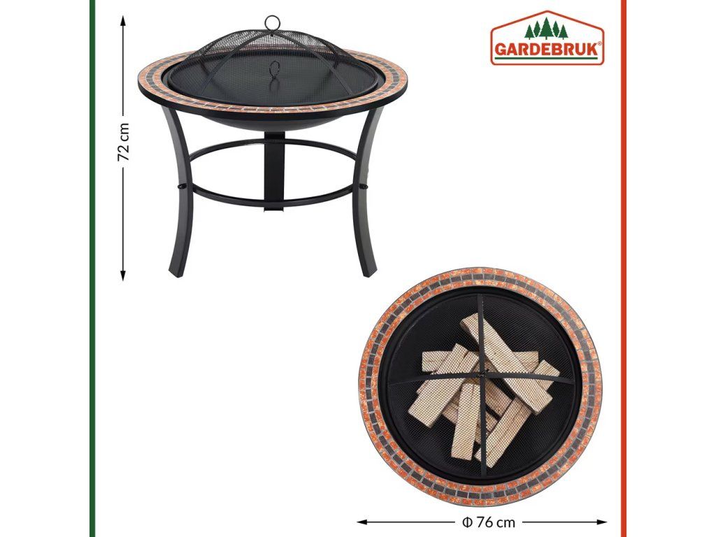Șemineul este decorat cu șeminee reale de mozaic, care creează un aspect extravagant. Cadrul topitoriei este fabricat din oțel acoperit cu pulbere și are un diametru de 76 cm. Datorită capacului practic, șemineul este folosit ca masă de încărcare și protejează, de asemenea, împotriva ploii, frunzelor și cenușii nepretențioase