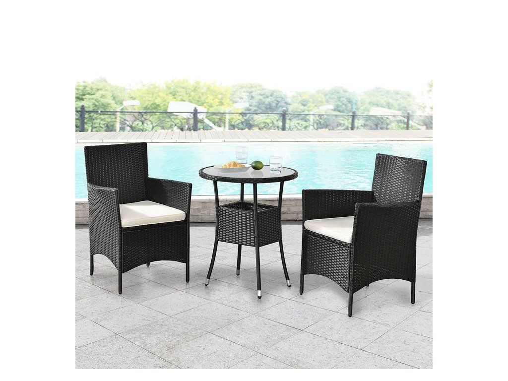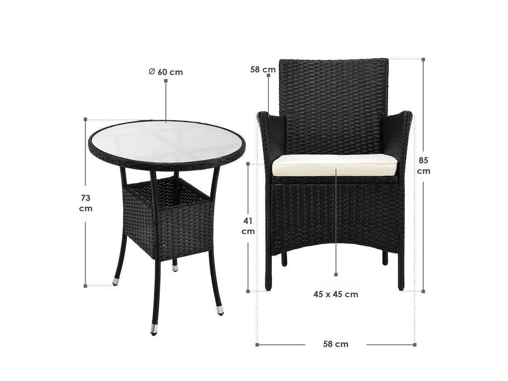 Un scaun triplu compus din masă și 2 scaune. Este ideal ca o cameră de balcon cu economie de spațiu pentru 2 persoane. Îmbunătățește-ți balconul acasă cu mobilier modern de grădină. O componentă a mesei de 60 cm este prevăzută cu o placă de sticlă. Placa de sticlă este completată perfect cu un aspect țesut din ratan. Materialul de înaltă calitate împreună cu barele transversale asigură o stabilitate ridicată. Pernele groase de 5 cm în culoarea bej vor avea grijă de o postură confortabilă. Potul este lipit de zipu și poate fi folosit în timpul curățării laterale. Polyratan este un material exterior ideal. Proutea este insensibilă la îngheț și rouă, este extrem de rezistentă împotriva influențelor poluante și are o durată lungă de viață. Elasticitatea ridicată îl face confortabil să se asezoneze chiar și fără căptușeală. Dacă mobilierul este murdar, îl puteți curăța pur și simplu cu o cârpă umedă.