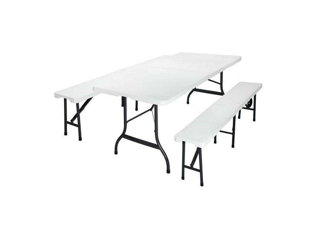 Setul practic pentru bere, realizat din plastic rezistent, oferă o ședere confortabilă cu întreținere minimă. Datorită designului pliabil, îl puteți monta rapid și utiliza chiar și în spații restrânse. Masa și băncile sunt echipate cu funcție practică de pliere, astfel încât pot fi ușor pliate la o dimensiune compactă de 91,5 cm și depozitate eficient pentru utilizări viitoare. Mânerele laterale, greutatea redusă și mecanismul tip valiză permit transport facil și depozitare comodă în portbagajul mașinii. Pentru utilizare sigură în interior, picioarele mesei și ale băncilor sunt prevăzute cu elemente de protecție care previn zgârierea pardoselilor sensibile.