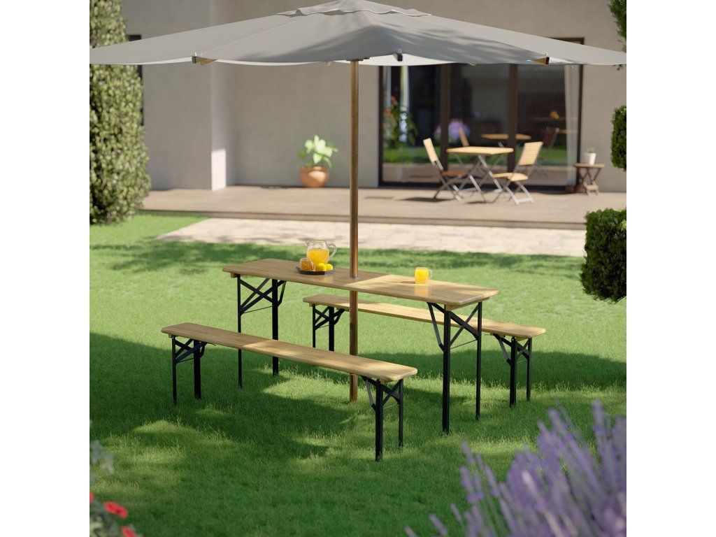 . Îmbinarea din 3 piese este echipată cu o masă de bere și 2 bănci. Cadrele mesei de pivniță sunt realizate din oțel acoperit cu pulbere, oferind o bază sigură pentru masă și două bănci. Acoperirea cu pulbere protejează cadrul metalic de expunerea la radiațiile UV. Tabla mesei și scaunul sunt realizate din lemn de brad de culoare naturală. Suprafețele sunt acoperite cu un lac transparent pentru a fi curățate. Datorită mecanismului de pliere și balamalei la îndemână cu funcție de fixare, toate elementele cortului pivniței pot fi pliate și depozitate în garaj.