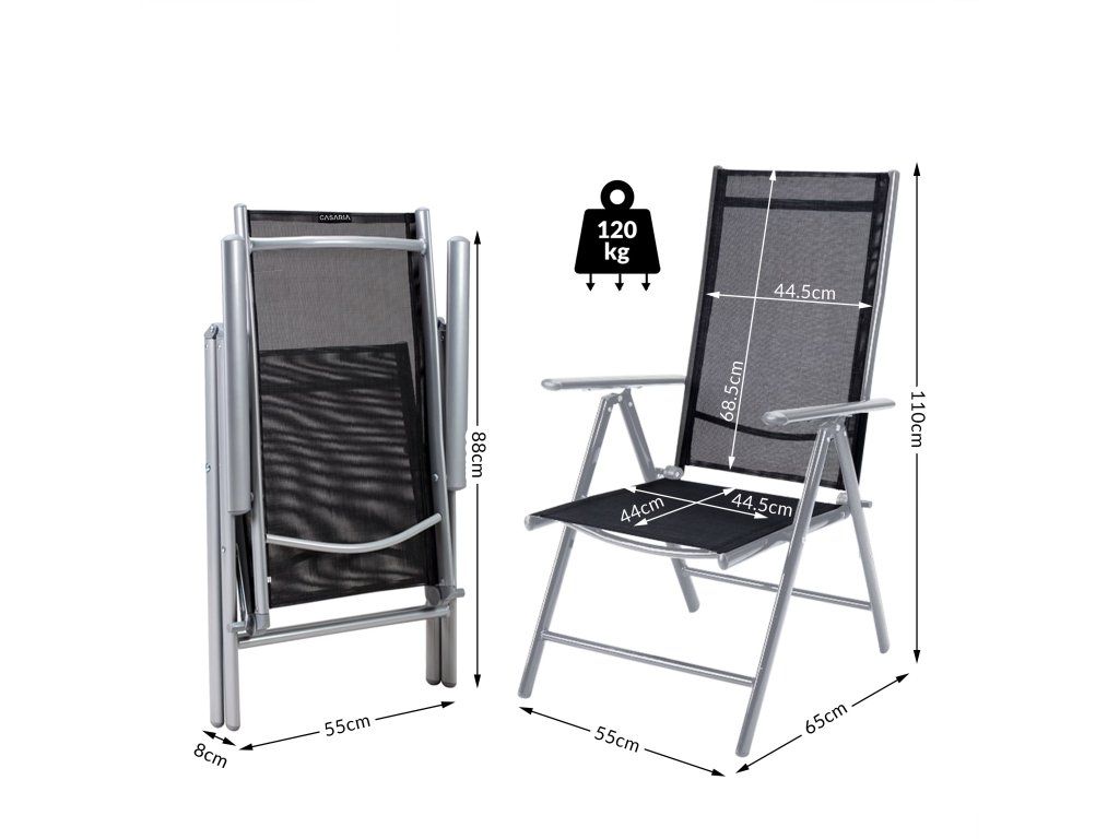 Setul practic pliabil de cruci de grădină are o operație, care poate fi setată până la 7 poziții diferite. Jgheaburile și barele sunt realizate din aluminiu. Șuruburile sunt fabricate din oțel inoxidabil. Datorită acestui fapt, acest grup are un scaun care poate fi ușor absorbit. Peretele din lemn sunt fabricate din materiale textile sintetice, nu rezistente la influențe de poluare și ușor de observat.