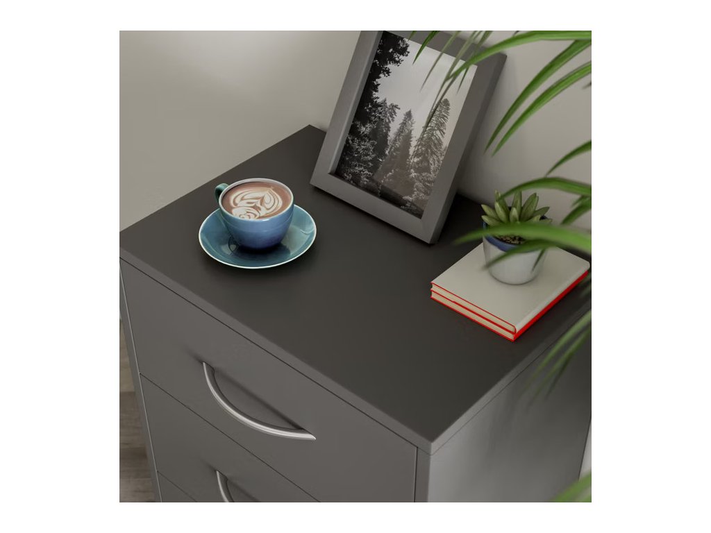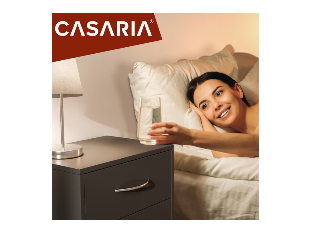 Noptiera simplă aduce o atmosferă plăcută în dormitor și poate fi combinată cu orice stil de mobilier. Datorită înălțimii de 54 cm, este ideală pentru paturi și ușor accesibilă. Trei sertare cu alunecare lină cu mânere în aspect cromat oferă suficient spațiu de depozitare pentru tot ceea ce trebuie să aveți la îndemână lângă pat. Telefonul mobil poate fi încărcat în primul sertar prin intermediul găurii integrate pentru cablu. Pentru o mai mare siguranță, puteți fixa noptiera pe perete cu ajutorul dispozitivului de siguranță din spate. Noptiera este fabricată din MDF stabil și, prin urmare, este deosebit de rezistentă și ușor de întreținut. Suprafețele se curăță ușor cu o cârpă umedă.Avantajele produsului: