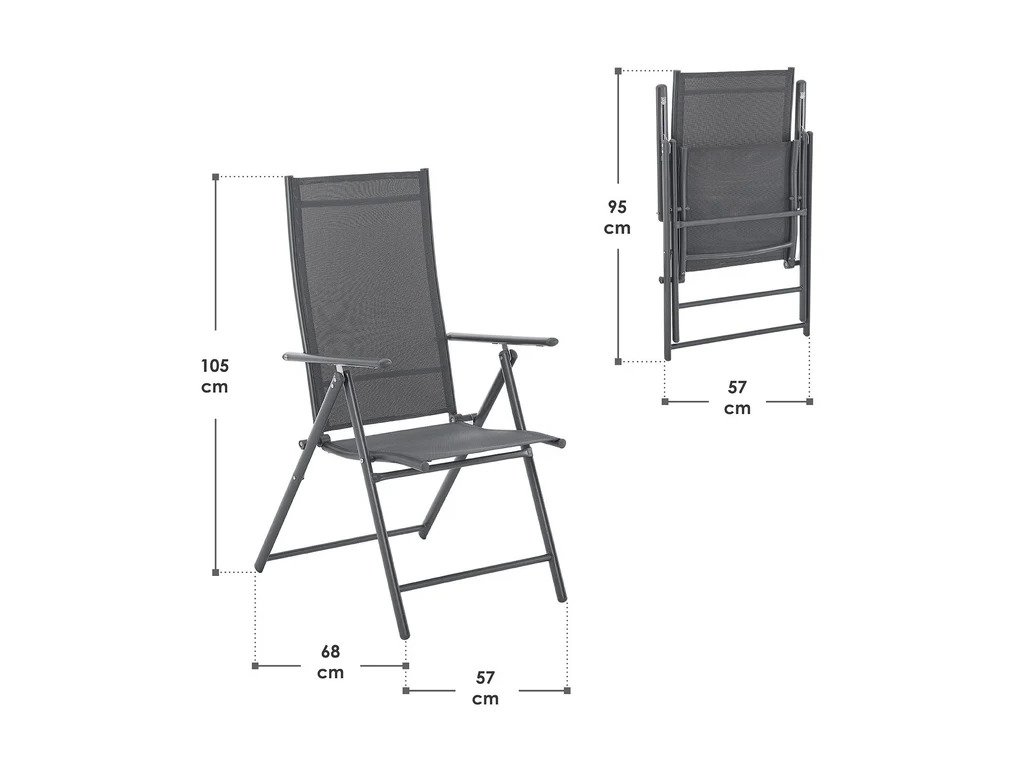 Aceste scaune ergonomic formate oferă un spătar reglabil în 7 poziții, permițându-vă să vă ajustați poziția după nevoie și să vă bucurați de confort maxim în timpul șederii. Cadru robust de oțel asigură stabilitatea și suportul fiabil chiar și în cazul utilizării pe termen lung. Materialul scaunului este respirabil, asigurând o ventilație plăcută chiar și în zilele fierbinți și contribuie la confortul general. Datorită mecanismului de pliere, scaunele sunt ușor de transportat și ideale pentru utilizare acasă și în călătorii.Construcția lor rezistentă poate face față diferitelor condiții meteorologice și, în același timp, oferă exteriorului dvs. un aspect modern și elegant. Pentru întreținere, este suficientă o cârpă umedă cu o soluție de săpun delicată, sau o perie moale pentru murdăriile mai rezistente. Dacă nu utilizați scaunele pentru o perioadă mai lungă de timp, vă recomandăm să le depozitați într-un loc uscat și protejat, pentru a le prelungi durata de viață și a le păstra aspectul și funcționalitatea.Specificații tehnice: