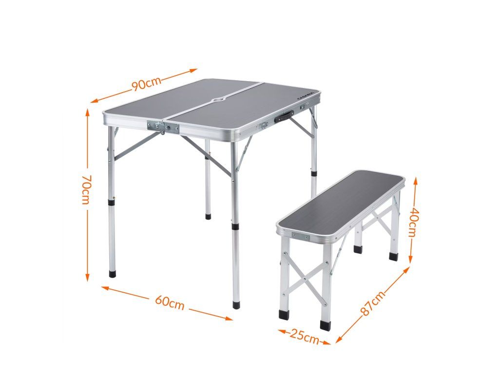 Acest set poate fi montat și demontat în câteva secunde. Funcția sa practică de tip geantă permite depozitarea băncilor în masa pliantă, economisind astfel spațiu. Datorită mânerului integrat, transportul este simplu și comod. Este perfect ca masă, masă de joc sau spațiu practic de depozitare. Designul ușor, pliabil, cu mâner pentru transport asigură o deplasare facilă și permite mesei și băncilor să încapă aproape în orice portbagaj. Designul lor compact asigură o manipulare și un transport ușor. În mijlocul mesei se află un orificiu pentru umbrelă, astfel încât să vă puteți bucura de umbră plăcută în zilele însorite.