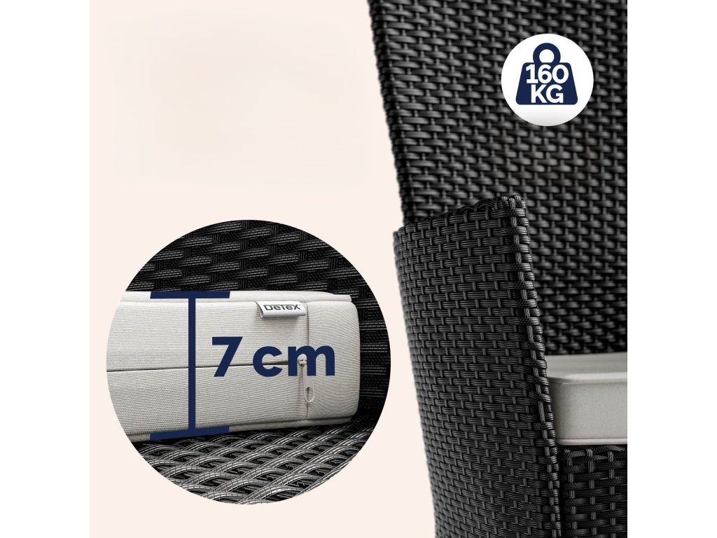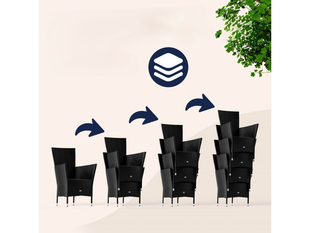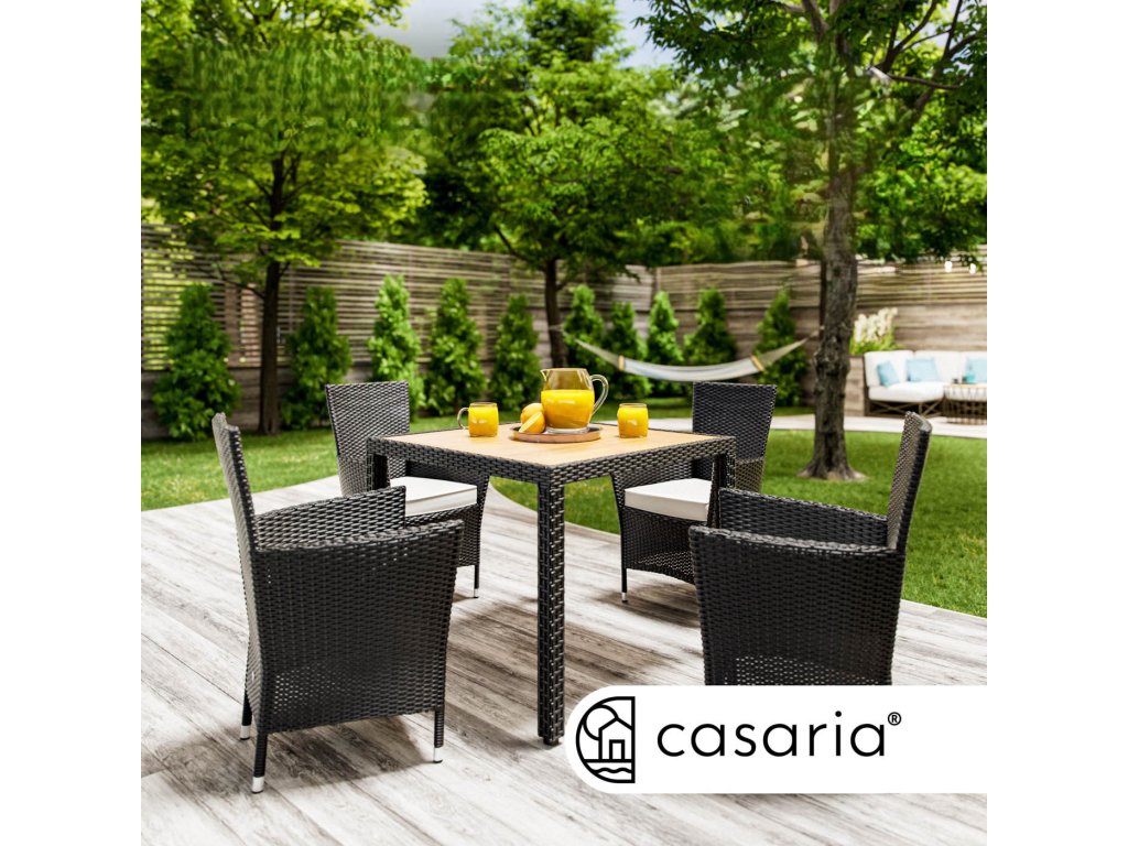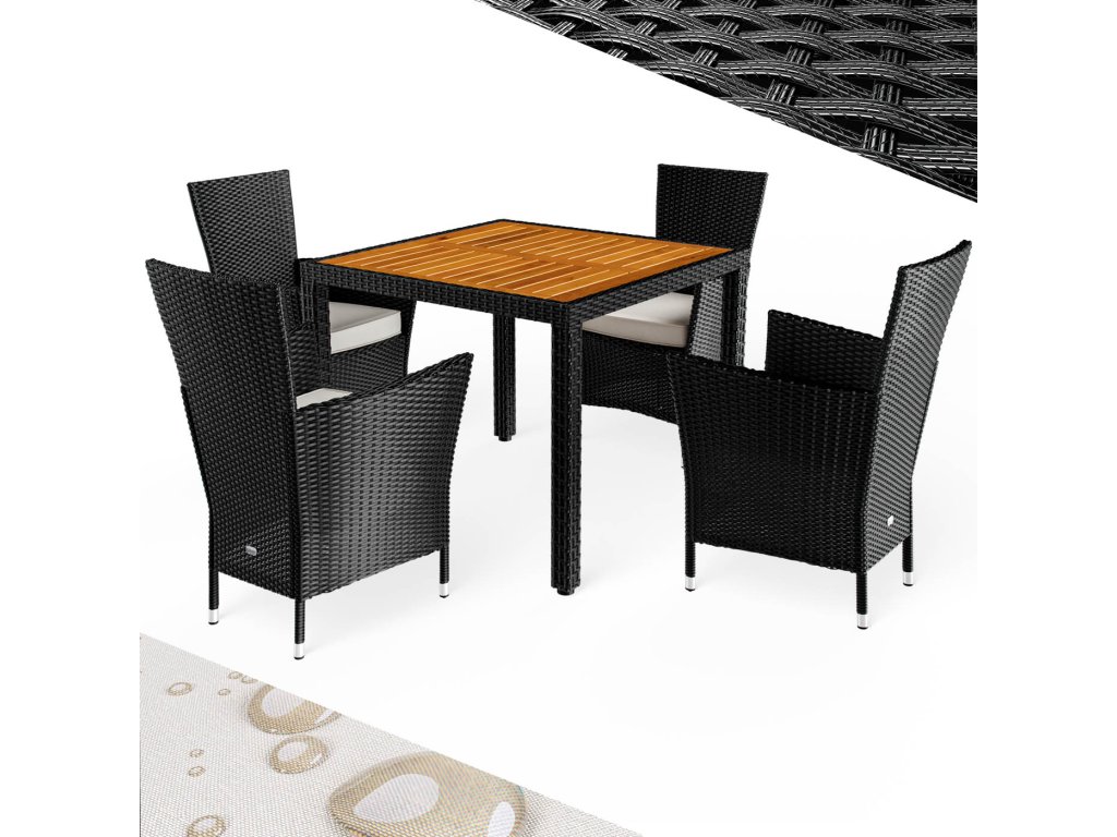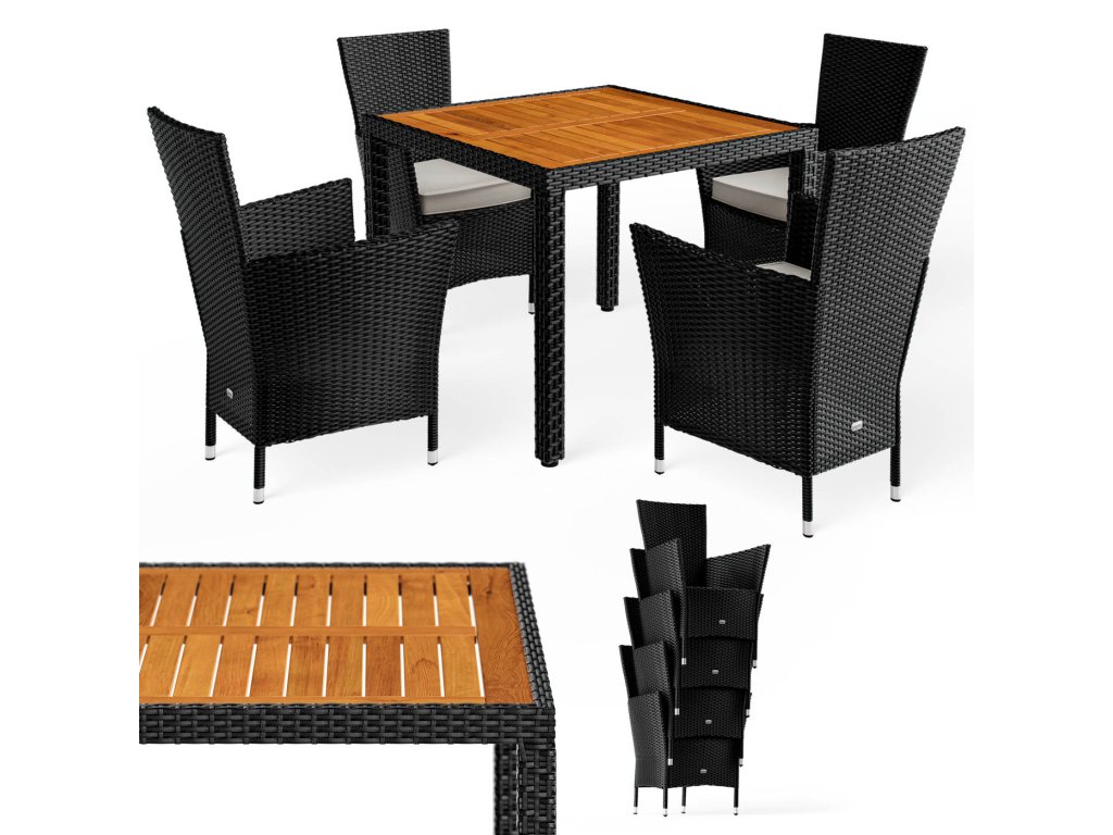 Setul de grădină din poliratan împletit manual, rezistent la condițiile meteorologice, include un masă cu dimensiunile de 90 x 90 cm și patru scaune de grădină stivuibile. Spătarele curbate, spătarele largi și pernele cu grosimea de 7 cm oferă confort maxim la ședere. Fiecare scaun din set poate susține până la 160 kg și pot fi stivuite cu ușurință pentru economisirea spațiului. Blatul mesei din lemn de agat conferă setului un aspect modern, cald și natural, care se potrivește perfect în orice oază de grădină.Beneficiile produsului:
