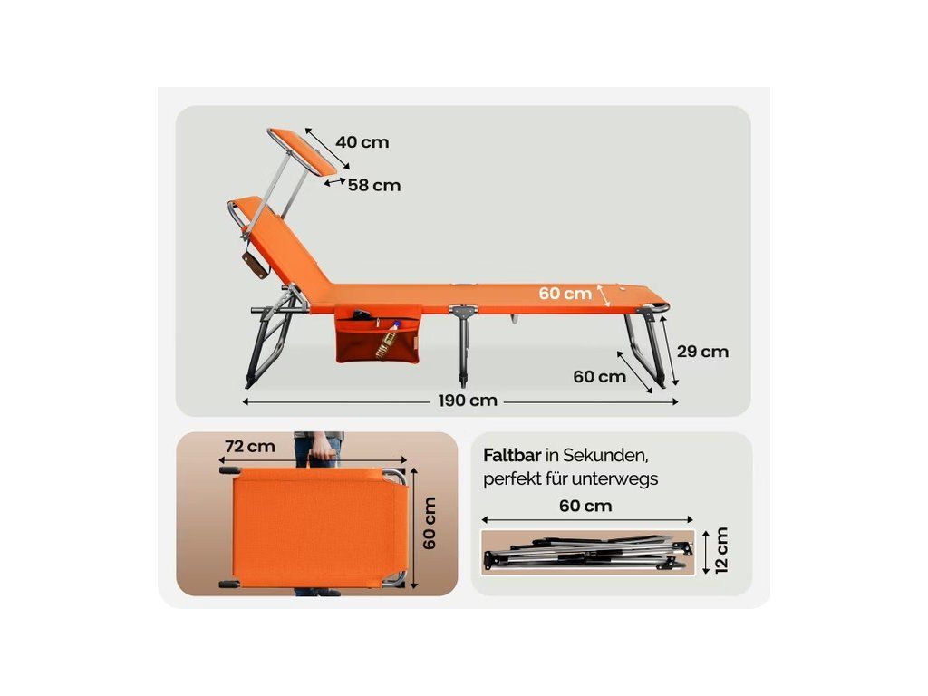 Șezlongul Ibiza are o utilizare versatilă și astfel vă puteți bucura de relaxare în timpul zilelor calde de vară. Spătarul șezlongului poate fi setat la 4 niveluri. O copertină de soare reglabilă vă va oferi o umbră perfectă. Șezlongul de grădină are un buzunar lateral cu plasă și un compartiment cu fermoar, care poate fi ușor închis cu un fermoar uscat. Șezlongul pliabil poate fi stocat eficient din punct de vedere spațial datorită designului compact și poate fi ușor transportat. Mânerele șezlongului sunt acoperite cu piele artificială, ceea ce le face mai ușor de purtat. Conexiunile metalice robuste și conexiunile de blocare extra întărite asigură o stabilitate solidă. Husa este respirabilă, robustă, stabilă dimensional și rezistentă la condițiile meteorologice și la radiațiile UV.Beneficiile produsului: