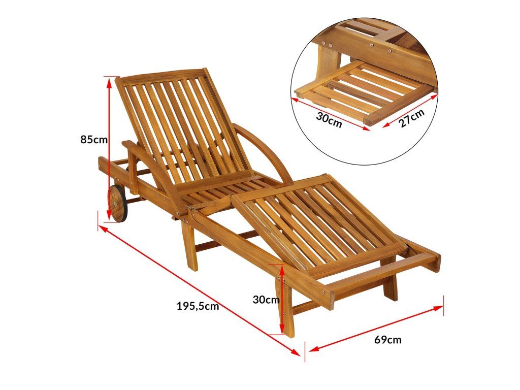 Șezlongul este reglabil individual și pliabil, realizat din lemn de acacia rezistent și durabil la intemperii. Spătarul poate fi reglat în patru poziții diferite, de la poziția culcat până la ședere verticală, iar partea pentru picioare oferă trei opțiuni de ajustare, permițând fiecăruia să găsească poziția perfectă pentru relaxare. Măsuța extensibilă practică pe ambele părți oferă suficient spațiu pentru băuturi sau cărți. Șezlongul poate fi pliat rapid și ușor, iar datorită celor două roți poate fi mutat și depozitat cu ușurință cu un efort minim. Bucură-te de confort în grădină, pe terasă, în grădina de iarnă sau chiar în living și creează-ți un colț perfect de relaxare. Șezlongul este ușor de întreținut, fiind suficient să fie șters cu o cârpă umedă. Pentru o durată de viață mai lungă și pentru a păstra aspectul frumos recomandăm utilizarea unui ulei special pentru mobilier de grădină.