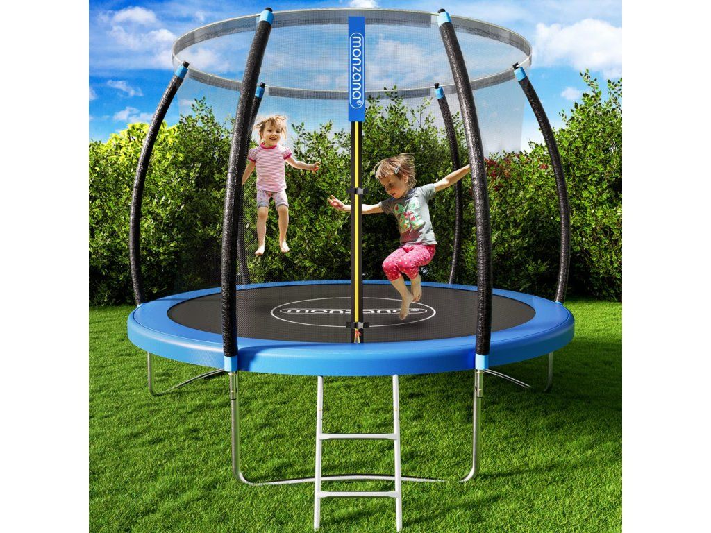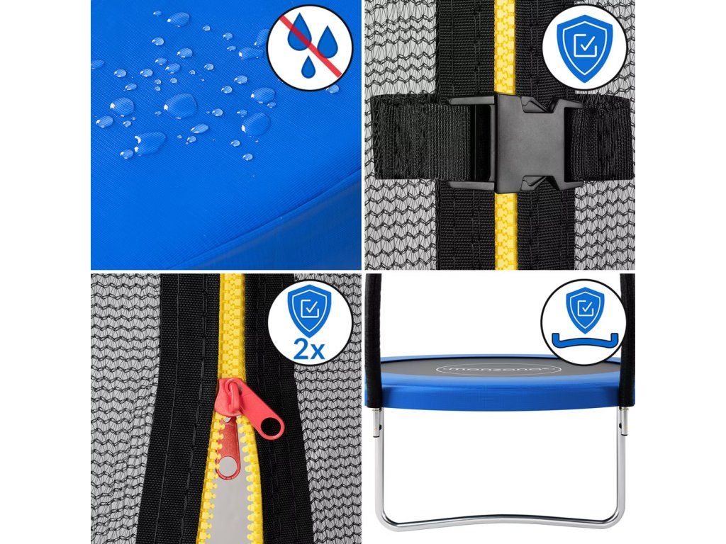 Trambulina de grădină de calitate este special concepută pentru exterior. În timpul scării pot fi antrenate și îmbunătățite coordonarea, mobilitatea și controlul corpului. Plasa de siguranță internă cu ochi înguste are un nivel ridicat de securitate datorită designului său revoluționar. Echipa trebuie să evite contactul cu arcurile metalice ale cadrului de oțel. Plasa este deosebit de rezistentă la rupere și influențe atmosferice. Intrarea este asigurată de o blocare cu două clicuri bine instalată. Covorașul negru de sărituri este fabricat din material PP de înaltă calitate rezistent la razele UV. Trambulina are 48 de arcuri, care sunt galvanizate pentru o durată lungă de viață. Datorită construcției foarte stabile a trambulinei, greutatea maximă este de 150 kg. Toate componentele trambulinelor sunt rezistente la apă și transpirație. Trambulina pentru copii este, de asemenea, stabilă datorită picioarelor în formă de W. 6 tuburi de cadru sunt fabricate din oțel zincat și au un diametru de 38 mm și o grosime de 1,3 mm. Pentru facilitarea montajului veți obține un compresor cu arc și o tijă